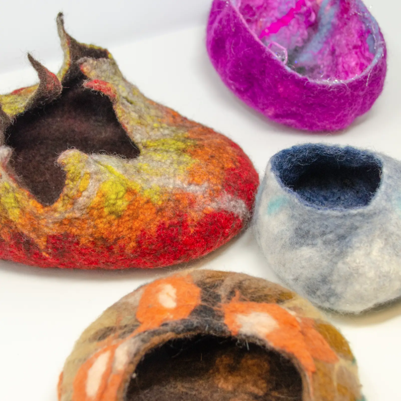 Learn the ancient art of wet felting in this hands-on workshop as we use wool, soap, water, and friction to create sculptural felt vessels rich with color and texture.